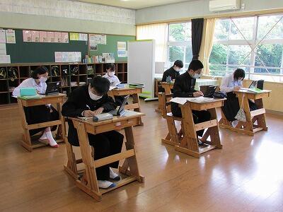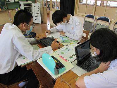 中学2年生の国語の様子です。「枕草子」について、自分が疑問に思ったことを調べてまとめる活動をしました。あと1時間調べ学習を行い、発表する予定です。