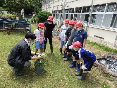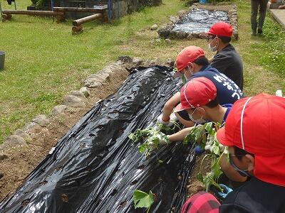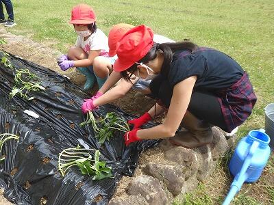まずは昨日の様子です。小学生がいもの苗植えを行いました。3年生以上の児童は、さいと学でいもの苗の植え方を事前学習していました。今回は、水平植えにすることにしました。苗と苗の間隔に気を付けながら植えました。これからは、どんなお世話が必要になるかを調べながら、みんなで成長を見守っていきます。