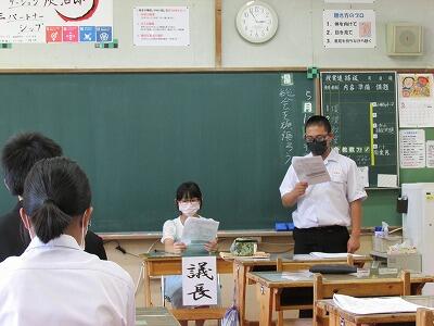 全校討議では、「地域に愛される学校にするためには?」という議題で、先日グループで話し合ったことを発表し合い、具体的な取組について考えました。