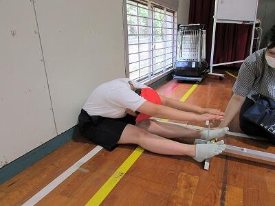 長座体前屈です。柔軟性を評価します。体育の先生に教えてもらったストレッチで記録アップを目指します。