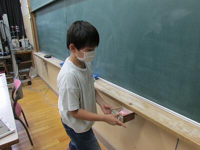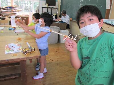 割り箸と輪ゴムを使って、鉄砲を作りました。厚紙で作った的に狙いを定めて上手に当てていました。みんなで的当てを競争して、得点を出しました。優勝は3年生の男の子でした。優勝メダルをもらって、喜んでいました。
