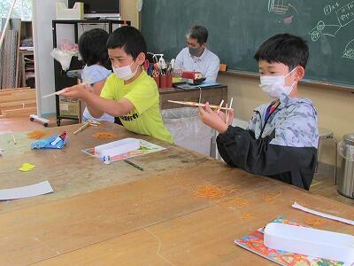 小学1年生から3年生は図工の時間に飛行機を作って飛ばしました。円形にした画用紙とストローで作った飛行機です。どのくらい飛ぶのか、皆で競争をしました。