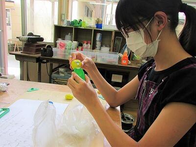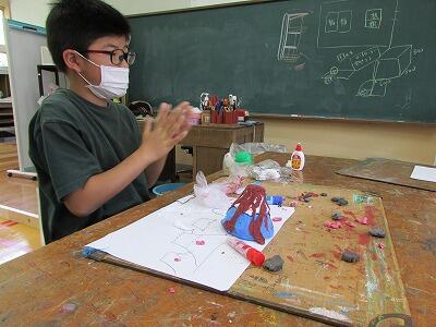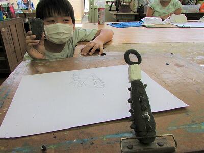 粘土を使って作品を作っています。 鬼の金棒や富士山、インコやトラックなど、それぞれが作りたいものの図面を描き、粘土で形を作っていきます。 細かいパーツなどは難しそうでしたが、捏ねたり整えたりしながら、丁寧に作っていました。
