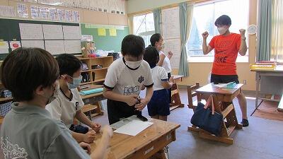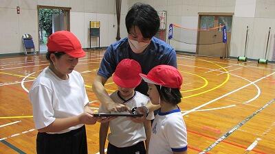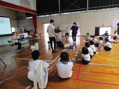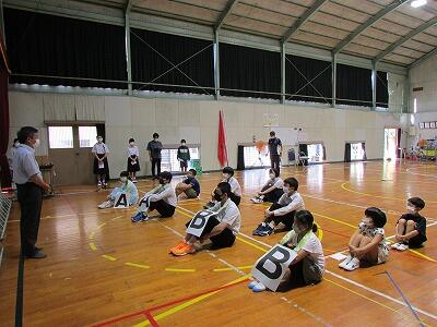 小学生の体育の様子です。2チームに分かれて、ポートボールをしました。どちらのチームも、声を掛け合いながらボールをつなぎ、得点を狙いました。6分間、一生懸命走り回ったあとはみんな汗だくになっていました。