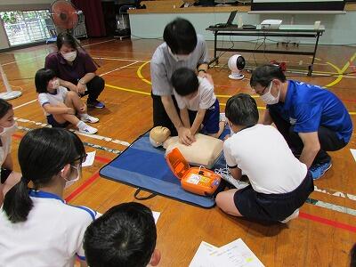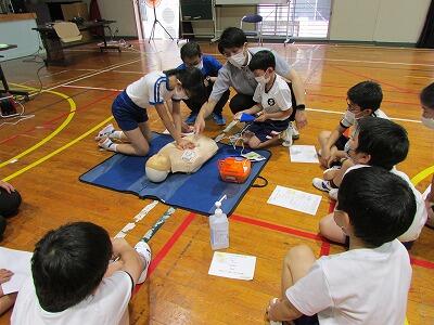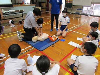 講習のあとはいよいよ実技練習です。3班に分かれて、傷病者発見からAED装着の流れまでを実践練習しました。小学生も真剣に話を聞いています。