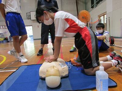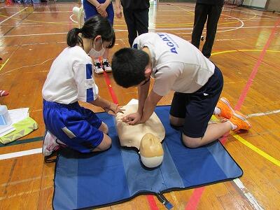 中学生は圧迫交代のタイミングも練習していました。呼吸を合わせて「3.2.1」のタイミングで交代し、なるべく中断しないように気を付けることができました。