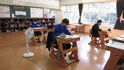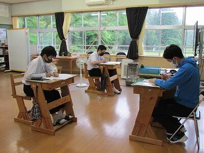 中学3年生の英語の授業です。3人とも真剣に問題を解いています。