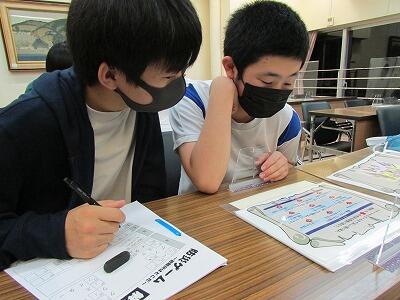 こちらの班では、「プールの時はどうするか」「休日や登下校の場合はどうするか」など、場面を想定して意見を出し合っています。銀鏡地区のAEDがある場所も確認しました。
