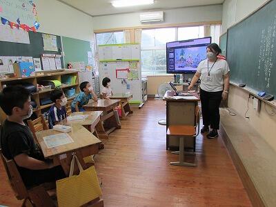 小学校5・6年生は英語の時間にALTの先生と一緒に海外との時差について考えたり、一日の生活の流れを英語で表現する練習をしました。