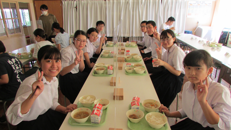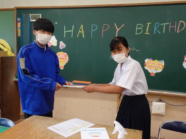 今日は、今年度初のバースデー給食を実施しました。誕生者の生徒にメッセージカードが贈呈されたり、音楽を流しながら給食を食べたりと、いつもとは違った少し特別な給食時間となりました。お誕生日おめでとう!