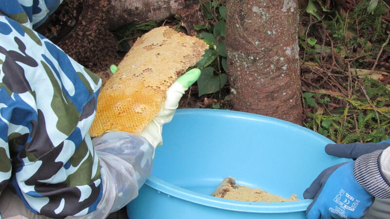 みつばちの巣からたくさんの蜂蜜を取り出し、パンにつけて食べました。とっても甘く、濃い味がしました。