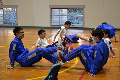 前半は短なわとびや大なわとび、後半は足を使ってボール渡しリレーをしました。