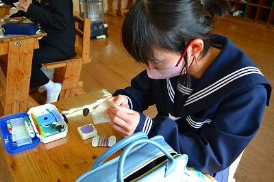 中学校2年生の家庭科です。一針一針、刺し子でコースターに模様を入れていっています。丁寧に縫っていました。