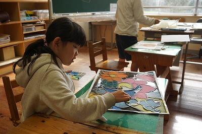 低学年は図工でステンシル版画を作っています。とても上手にできていますね。