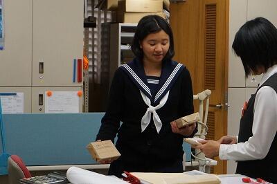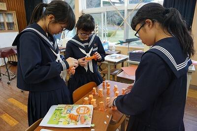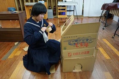 中学3年生は、来週の「幼児体験学習」に向けて、おもちゃ作りをしました。