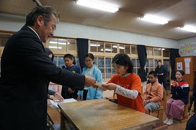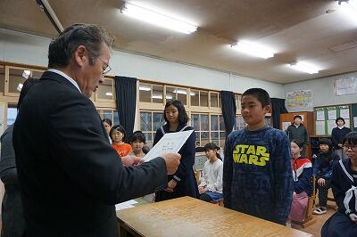 午後は不審者避難訓練がありました。銀鏡派出所の駐在さんのご協力の下、緊張感ある訓練ができました。「おはしもち」をしっかりと守って素早い避難ができていました。「素早い避難ができていましたね。」と駐在さんからお褒めの言葉をいただきました。