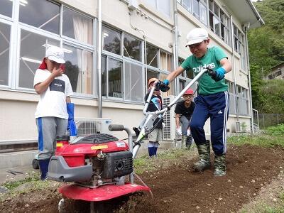 肥料をまき、耕耘機で土をたがやし、草取りをして完了です。子ども達は、はじめての耕耘機に驚きながらも楽しんで挑戦していました。