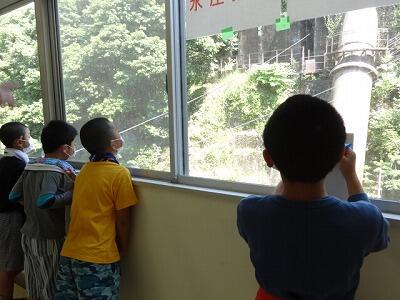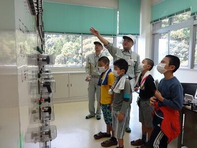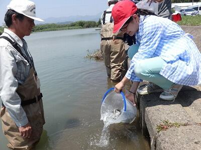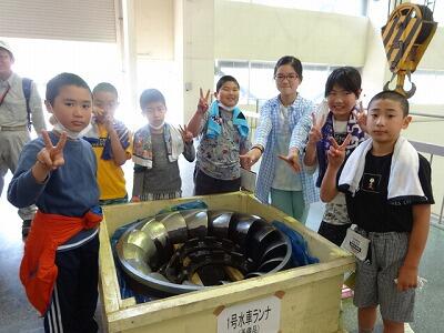 水力発電がどのように電気を作るのか、実際に水を流して発電するところまで見学できました。その後稚魚の放流をさせていただきました。