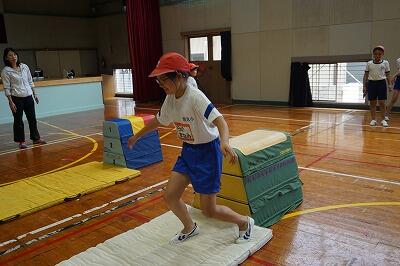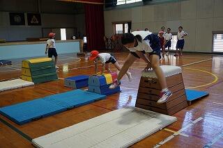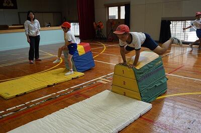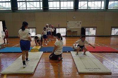 体育は、全員で台上前転の練習をがんばりました。最初の時よりもみんな上手になっていました
