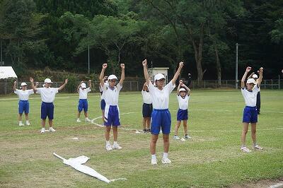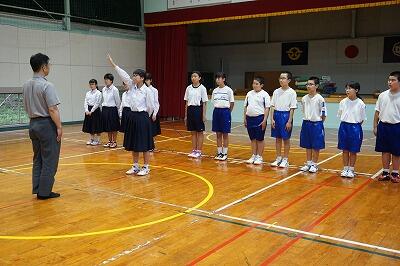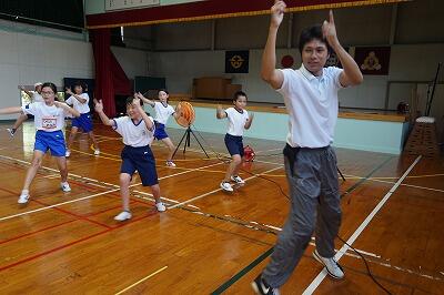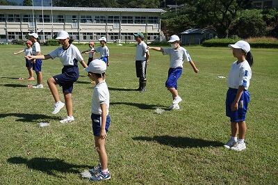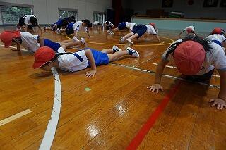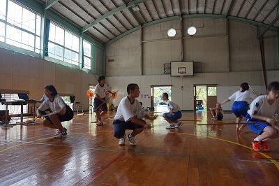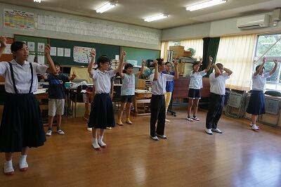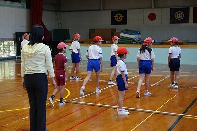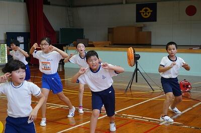 体育の時間、小学生は、運動会に向けて臼太鼓踊りの練習をしました。去年踊った子どもも今年初めて踊る子どもも、とても上手に踊れています