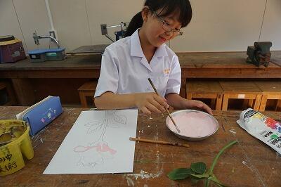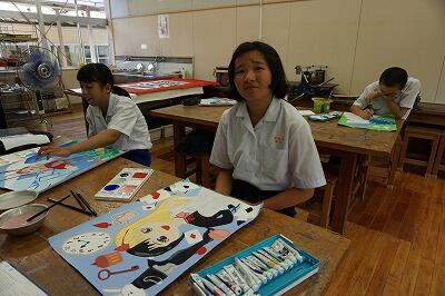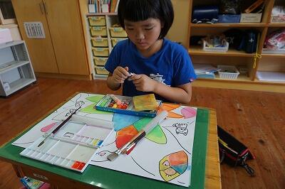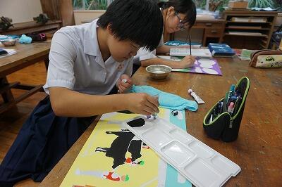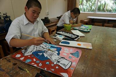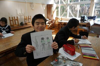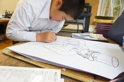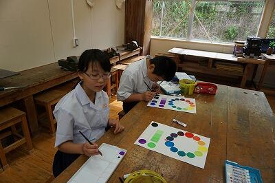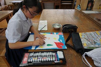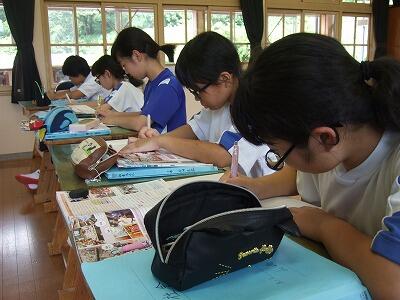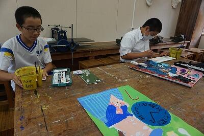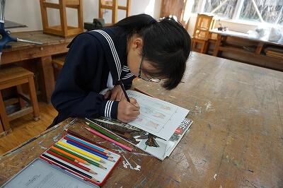 中学2年生は美術で感想画を描きました。とても集中して描いていますね。