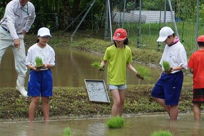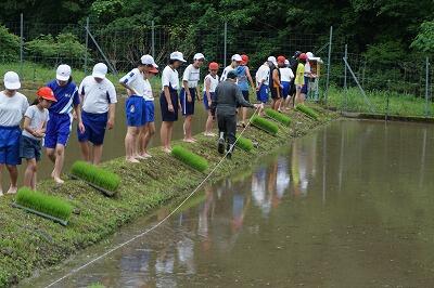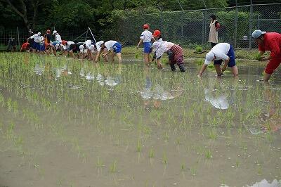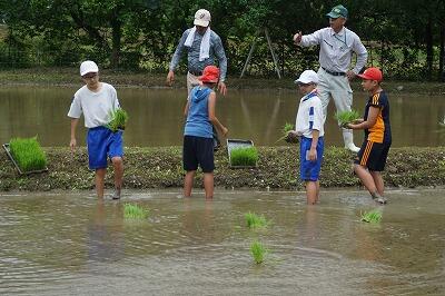 農業体験学習では、地元の方のご指導を仰ぎながら田植えをしました。