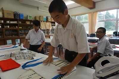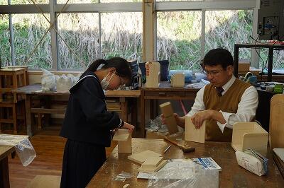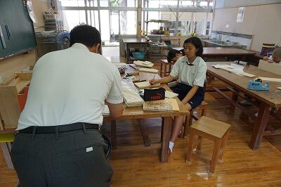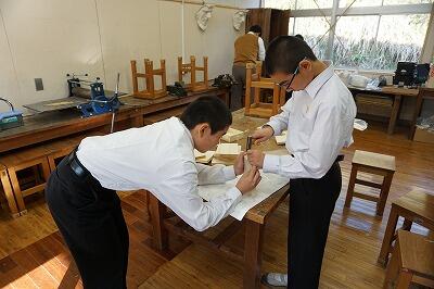 中学1年生は、技術で本棚を制作していました。難しい作業のところは、先生に教えてもらい、友だちと協力しながすすめることができました。