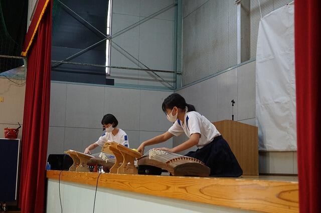中学2年生女子による器楽「さくら」の予行の様子です。演奏はもちろんのこと、重たい琴を自分たちで用意して片付ける作業も自分たちで進んで行っていました。2人の奏でる美しい旋律に、きっと会場中の方たちが見惚れてしまうことでしょう。