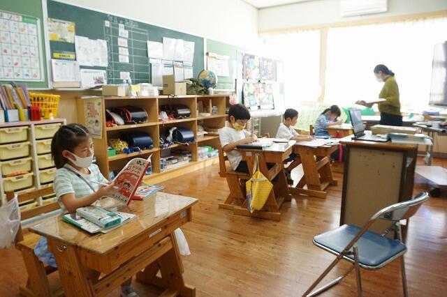 小学1年生の授業です。姿勢に気を付けながら、国語の書取を行っていました。3人仲良く、今日も勉強や掃除に頑張っています!