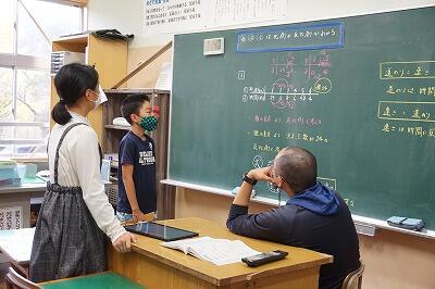 小学4年生の算数では、問題プリントを解いていました。自分で問題を解いた後、先生の確認を受けて自分の学力をつけようと取り組んでいました。