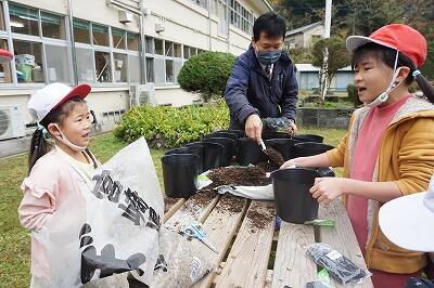 小学1・3年生の生活科・理科の授業では、学校近くの林でたくさんのドングリを集めることができました。昼にはドングリの駒を作って上手に回していました。