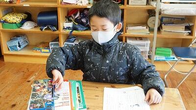 小学1・3年生の国語です。冬休み課題を終えての確認テストでした。どんどん問題を解いている子どもたちの「先生!解けました。」の声が元気に廊下まで聞こえてきました。