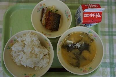 麦ご飯、牛乳、すまし汁、サンマかぼす煮、おかか和え