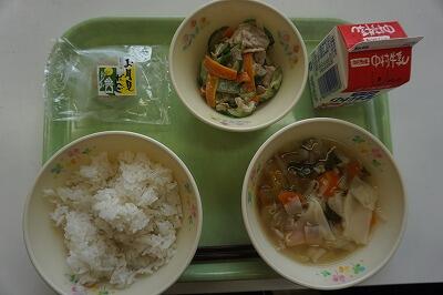 麦ごはん、牛乳、さつま汁、野菜のアーモンドあえ、カルフィッシュ