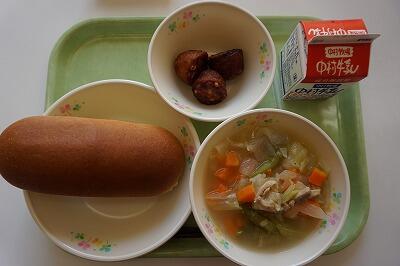 ドッグパン、牛乳、さつま芋ポタージュ、ウィンナー、コールスロー