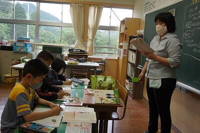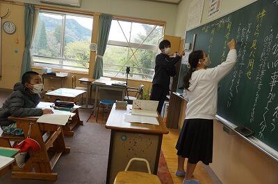 小学1・3年生の国語の授業です。一文字一文字を丁寧に書いています。書き終わった後は、先生に確認してもらいました。褒められて、にこにこのみんなです。