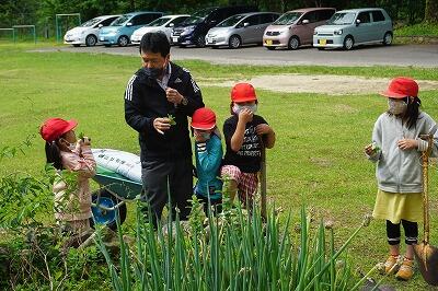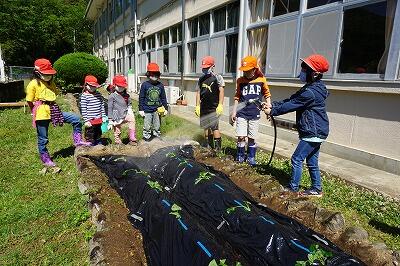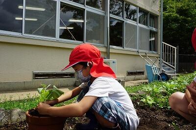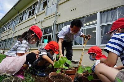 小学生は1,2時間目に菜園を耕してサツマイモの苗を植えました。