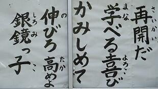 このメッセージは、銀上学園の児童生徒・PTAみんなで考えたものを書にして、2週間交代で掲示していこうと考えています。