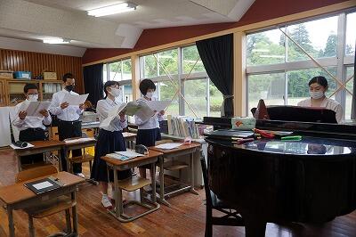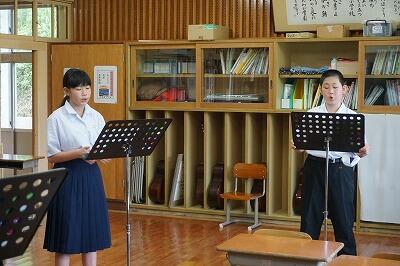 小学1・3年生の音楽の授業です。校歌の歌詞をみんなで声に出して確認して