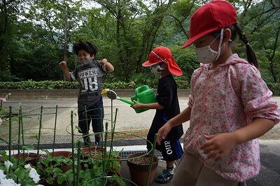 自分たちで植えたあさがおに水やりをしている様子です。緑の立派なつるがぐんぐん伸びてきています。早くきれいな花が咲くといいですね。