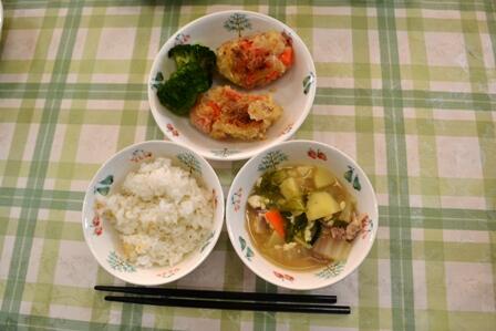 【ごはんと豚汁】は5年生、【ツナポテトハンバーグ】は6年生が作りました。