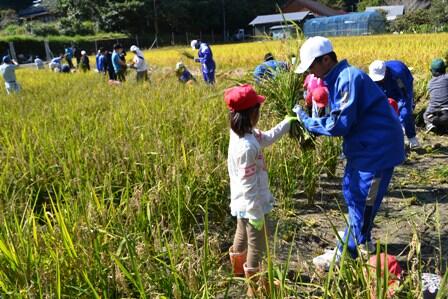 今日の午後は、小・中学生みんなで稲刈りをしました。6月に田植えをした稲には、