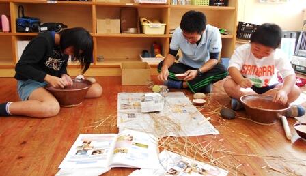 1学期からバケツ稲で育ててきたお米を、すり鉢とすりこぎや石を使ってのもみすりでした。
