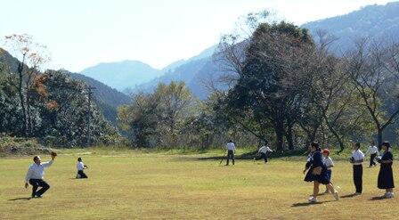 この大自然の中で、小学生は体育でティーボール、中学生も昼休みにキャッチボール