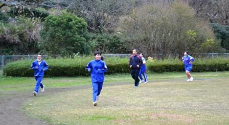 先生も一緒に「人生向上の坂道」をダッシュして筋トレ中。先頭を走っているのが顧問の先生です!!