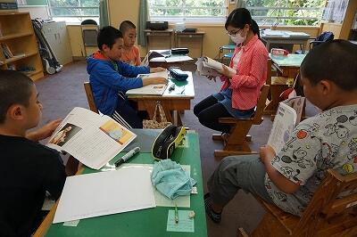 中学校の先生にも入っていただきながら少人数でもしっかりとした授業を行っています。3年生は国語、5年生は算数「公倍数を使った問題」6年生は算数「拡大・縮小」の授業でした。