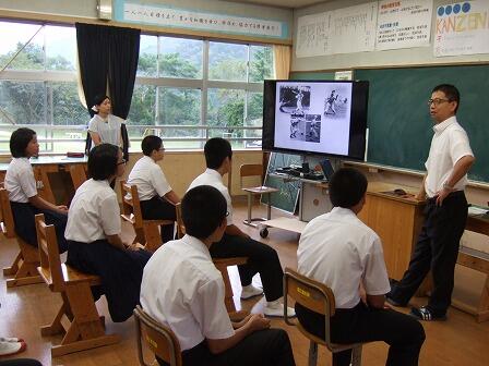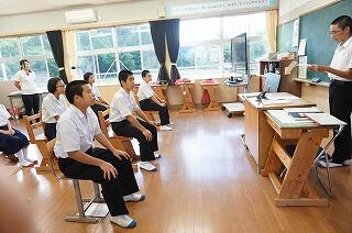 中学生は昨日学習した土砂災害防止教室を振り返り、自分たちの生活と照らし合わせて注意しなければならないことなどを考えました。銀鏡地区には危険箇所がたくさんあるので、これから雨が多くなる時期に細心の注意を払うようにという二見先生の話を真剣に聞いていました。