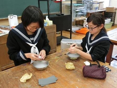 銀鏡神社の版画板にインクを付け、印刷をしました。