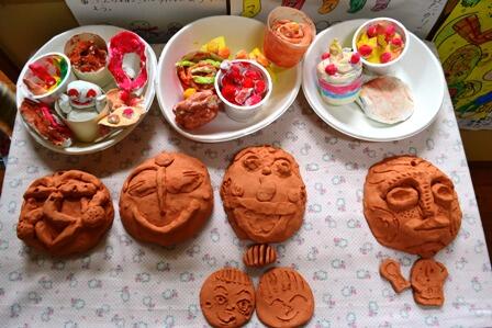 小学1.2年生の作品で、下の楽しい顔は、遠足で作ったお面です。