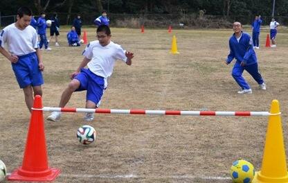 今日の中学生の体育はサッカーでした。パスしながら2対1でゴールまでボールを運ぶ練習をしています。